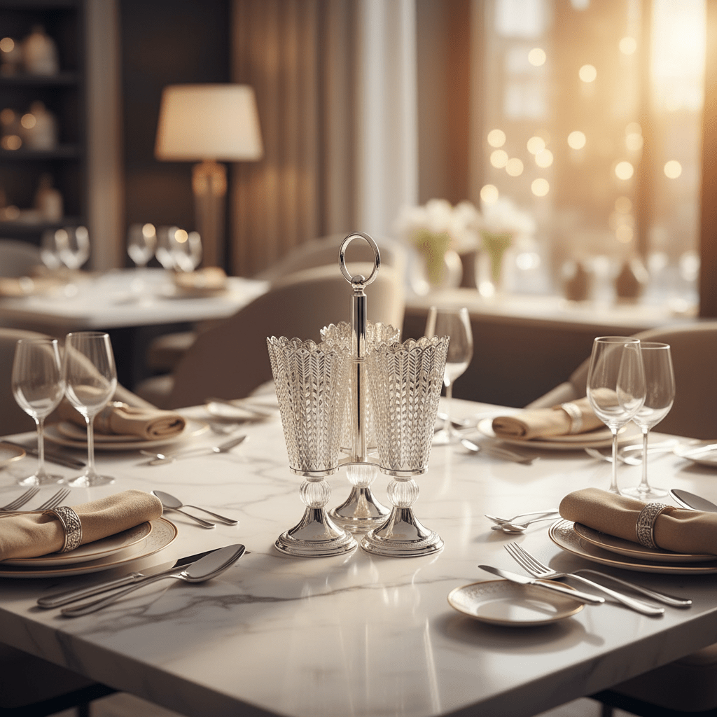 أضف لمسة من الرقي المتميز إلى مطبخك أو طاولة الطعام مع طقم حامل أدوات المائدة الفضي من AKDC المكون من 3 قطع. صُمم هذا المنظم المذهل لأولئك الذين يقدرون أدق التفاصيل، ويجمع بين العملية والجمال الفاخر - مما يجعله القطعة المركزية المثالية لتناول الطعام اليومي والمناسبات الخاصة على حد سواء.