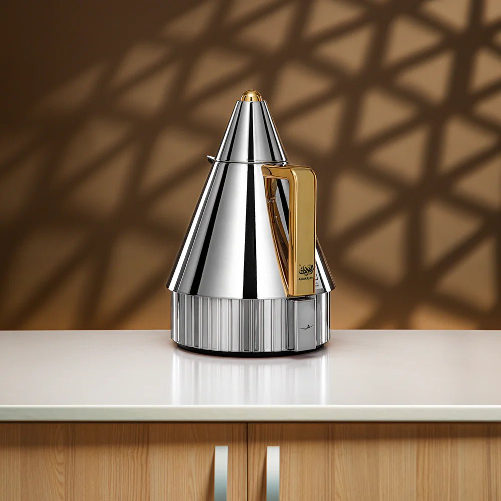 The Almarjan Vacuum Flask Set in silver and gold pairs a polished metallic body with warm gold accents for a refined, contemporary look. The architectural cone-shaped silhouette and ribbed lower detailing create a striking yet balanced design. Each flask operates independently through a push-button lid, allowing tea and coffee to be served separately with ease. An insulated glass liner helps maintain temperature, making this set ideal for both daily use and elevated hosting.