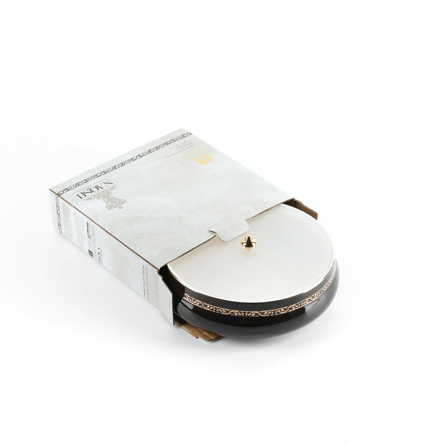This large 23.5cm ceramic bowl features a deep black finish complemented by rich gold accents. Ideal for serving generous portions of dates, nuts, or sweets. The matching lid ensures freshness and cleanliness. A luxurious choice for festive or formal gatherings.