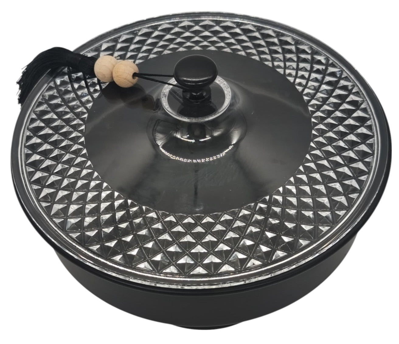 Slightly taller at 21cm, this black candy bowl adds vertical flair to your setup. It features a clear lid to display contents while protecting them. The footed base enhances presentation. Ideal for luxurious or contemporary decor themes.