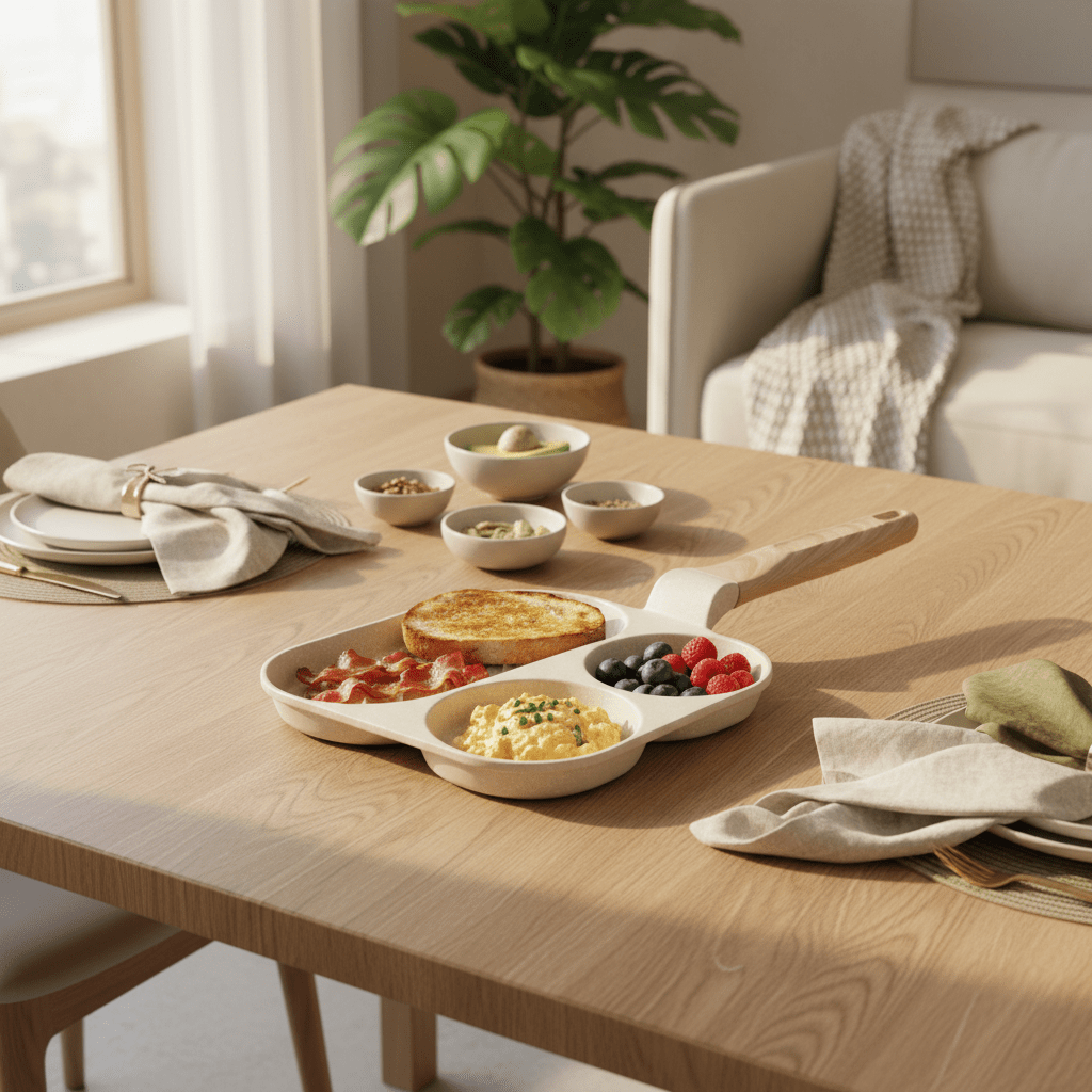 AKDC 3-in-1 Multi-Section Non-Stick Pan with Wooden Handle – Beige, 20 cm
