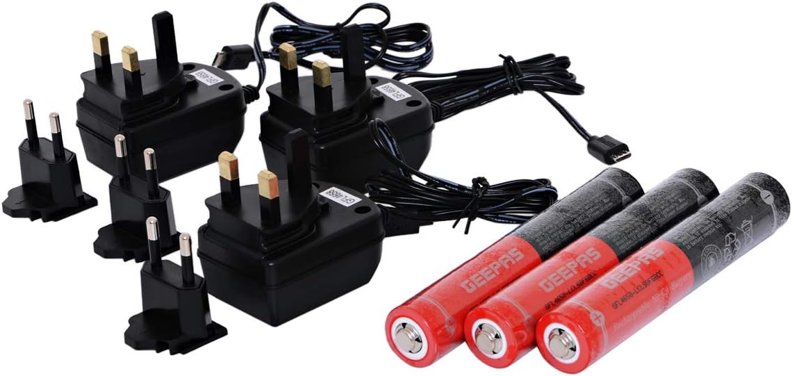 Geepas GFL4658 Super Bright Rechargeable LED Flashlight Set of 3 | 2000 Meters Ultra Long Range Beam | Waterproof Heavy-Duty Torch with Charger and Battery