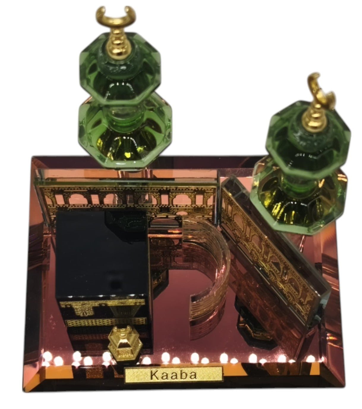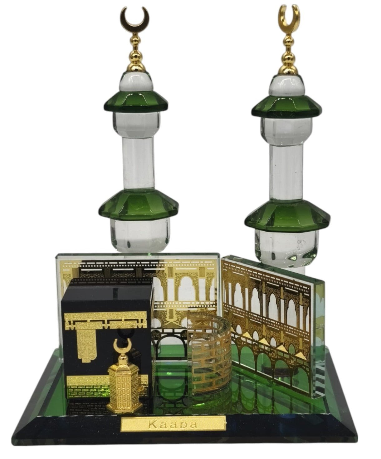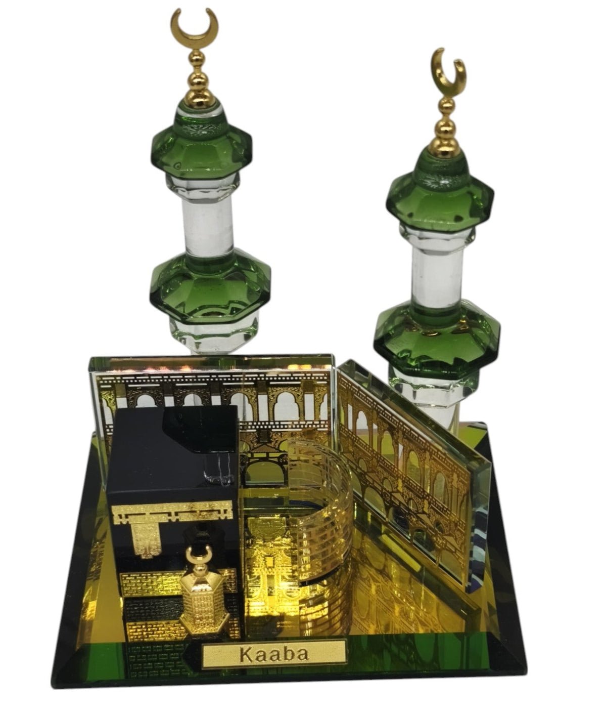 AKDC Kaaba Gold-Plated Crystal Glass Showpiece with Minaret – 12x15cm in elegant green and gold. A refined collectible and décor piece, perfect for home, office, or gifting occasions.