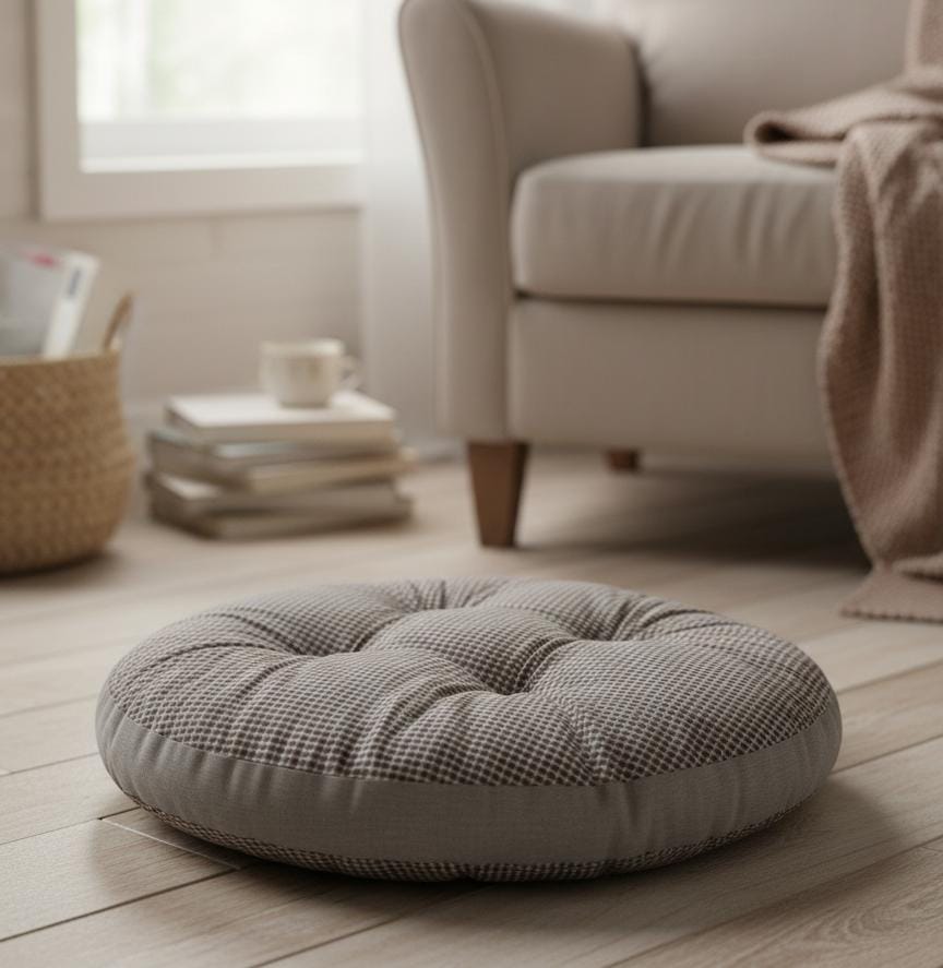 AKDC Large Round Cotton Floor Cushion – White with Brown Plaid Pattern, Cozy Floor Cushion, 55×55×12 cm
