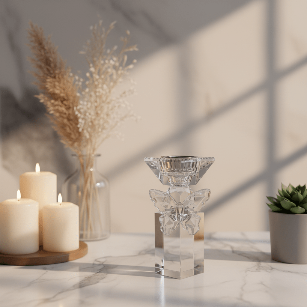 Elevate your space with this exquisite crystal glass incense burner, where artistry meets tranquility. Featuring an elegant rectangular base crowned with a delicate butterfly motif, this piece transforms your daily ritual into a moment of pure luxury.