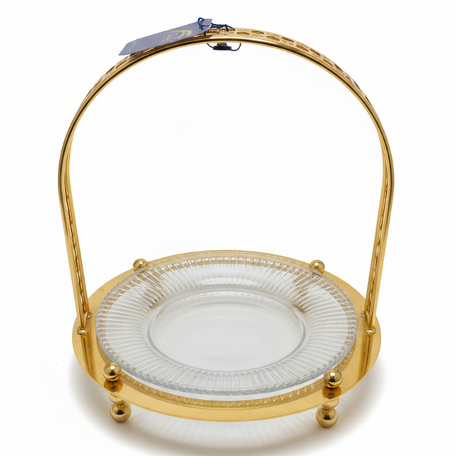 Elevate your hosting experience with this luxurious gold-handled glass serving basket, where timeless craftsmanship meets everyday elegance. Featuring an ornate gold-plated arched handle with intricate cutwork detailing, this statement piece cradles a precision-ribbed crystal-clear glass plate that catches and reflects light beautifully.