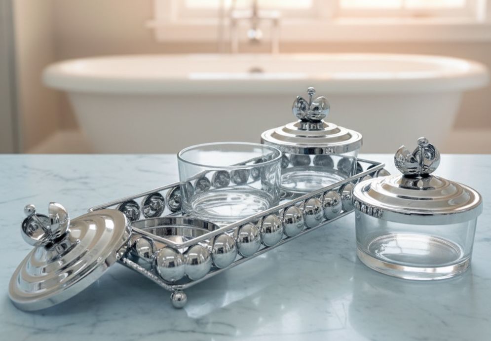 A 3-piece candy bowl set featuring silver metal and glass. Perfect for presenting snacks, sweets, or dry fruits. The elegant design enhances any table setup. Durable and easy to maintain.