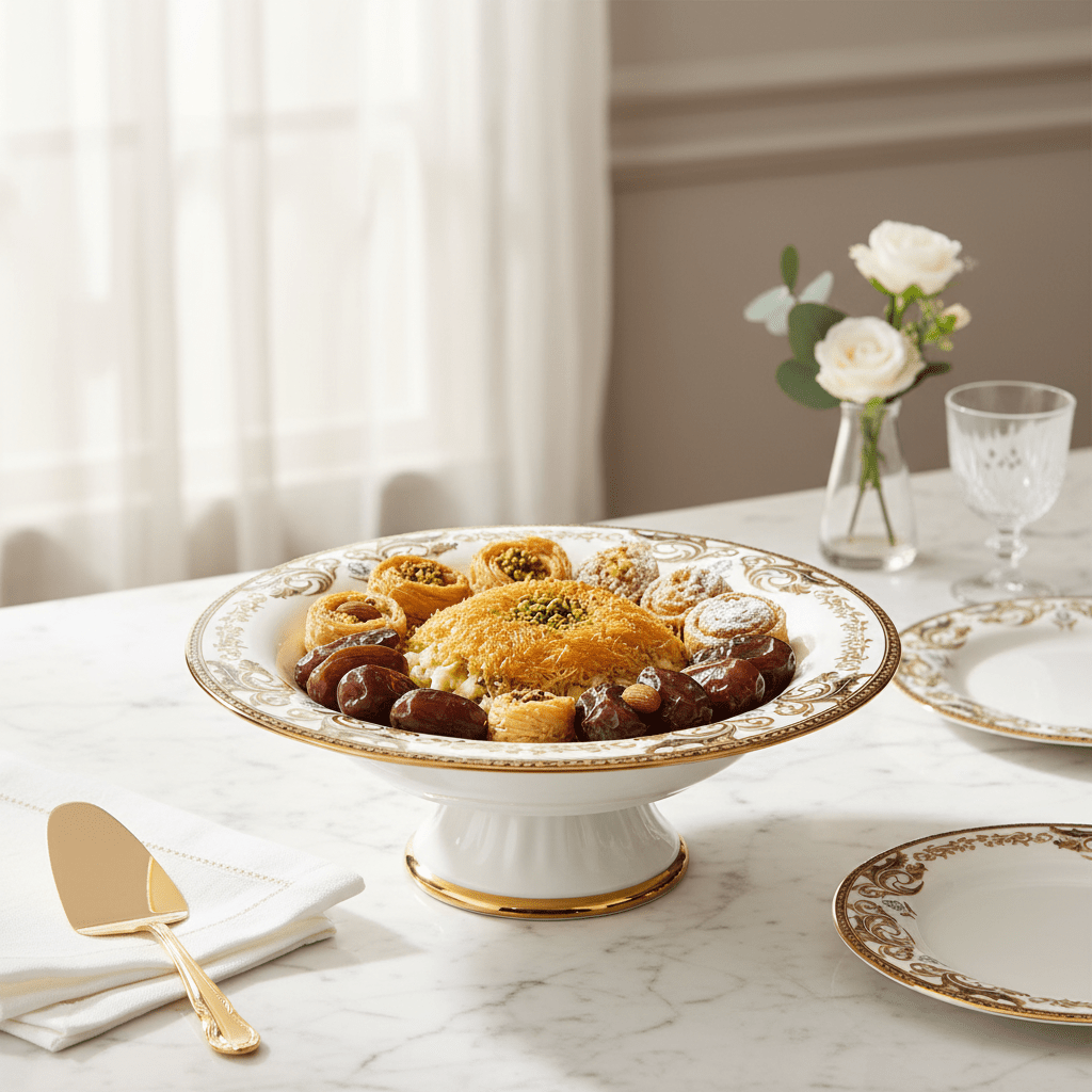 The AB-143 Ceramic Pedestal Bowl is designed to serve as a refined centerpiece with timeless appeal. Finished in smooth white ceramic and elevated on a sculpted pedestal base, it adds height and structure to table settings while maintaining a clean, balanced silhouette. The subtle gold rim introduces a controlled touch of luxury, framing the bowl without overpowering its minimalist form. Its raised pedestal enhances visual presentation, making it ideal for serving fruits, desserts, dates, sweets, or decorative arrangements. The smooth ceramic surface reflects light softly, reinforcing an elegant look suited for modern homes, formal dining, and professional hospitality environments. With a generous 31 cm diameter, the bowl offers ample space while retaining a composed, premium presence.