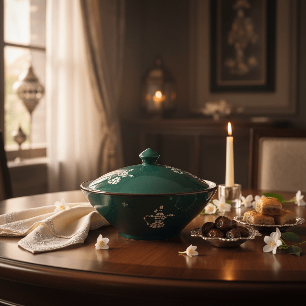 Elevate your entertaining with this exquisite 10-inch ceramic halwa serving bowl, where traditional craftsmanship meets contemporary elegance. Finished in a rich emerald green glaze and adorned with delicate silver floral motifs, this lidded serving piece transforms everyday moments into occasions worth celebrating.