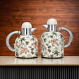 Designed with a sculpted rounded silhouette and polished metallic accents, this 2-piece vacuum flask set combines contemporary structure with decorative botanical detailing. The soft light base is enriched with layered palm tree illustrations and subtle floral accents, creating a distinctive statement piece that feels both fresh and sophisticated.