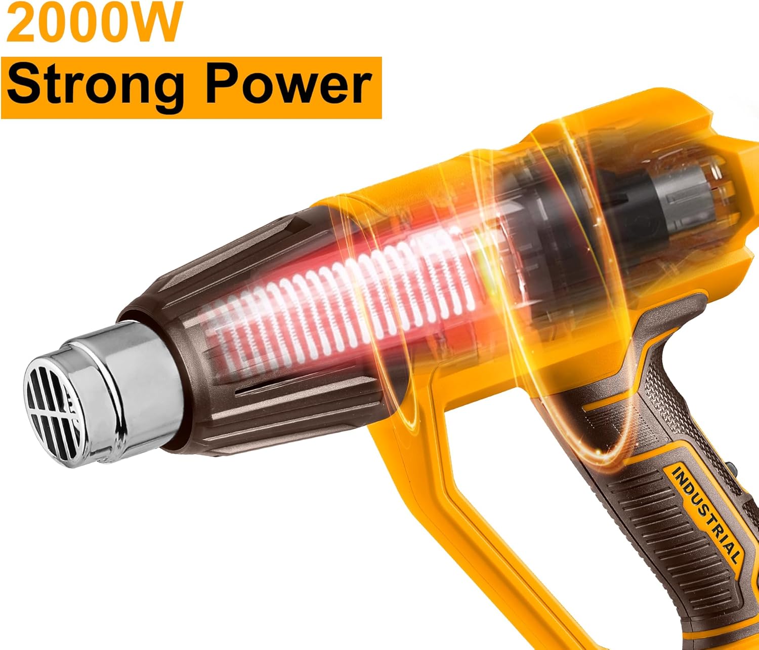 2000W motor provides quick heating. Adjustable heat levels for various tasks. Ideal for shrink wrapping and paint removal. Lightweight design for easy handling.