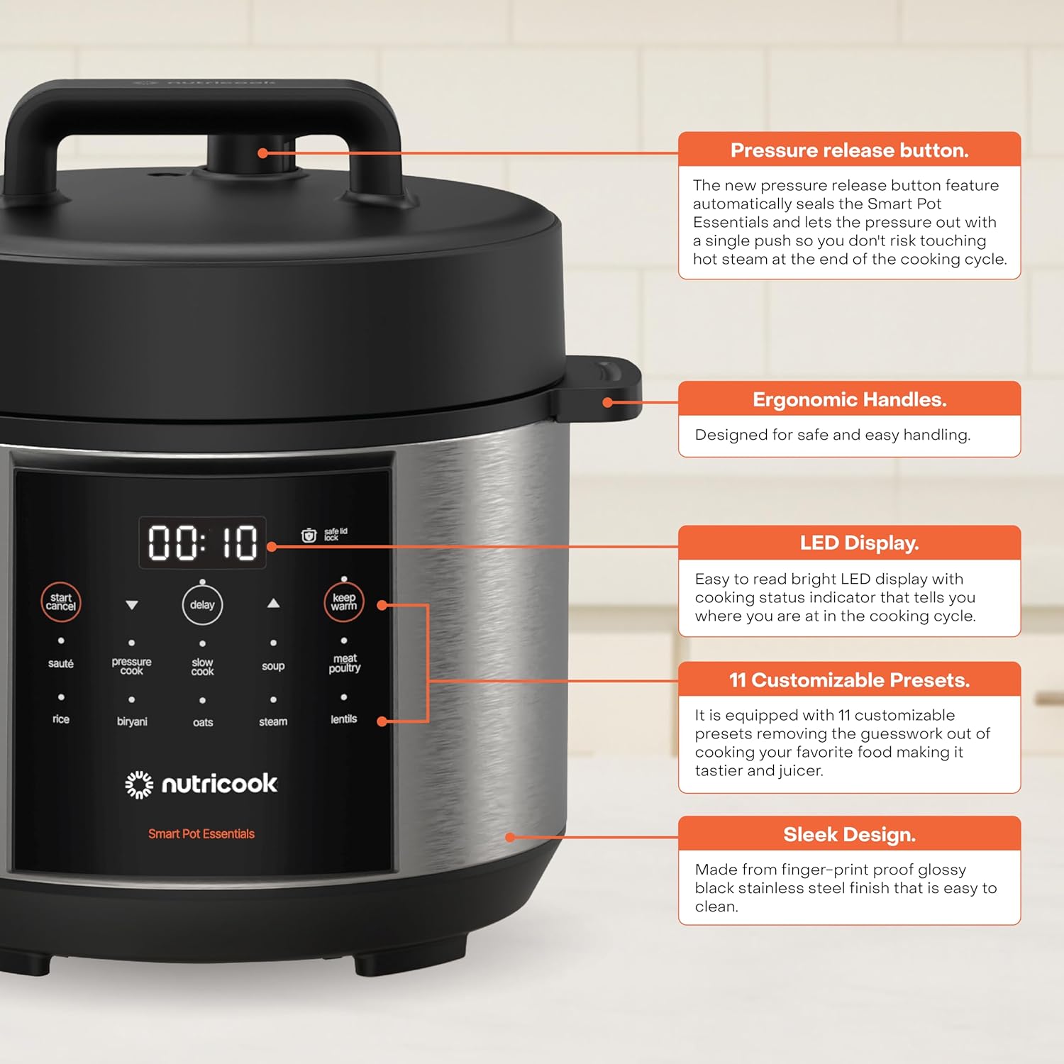 Nutricook Smart Pot Electric Pressure Cooker, 4L Capacity, 900W, 11 Cooking Programs, Dishwasher-Safe, Food-Grade Stainless Steel Pot,Built-in Safety Features,NC-SP150