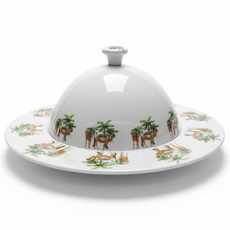 Yuniverse Melamine Serving Tray with Dome Lid – 32 cm White with Camel and Palm Tree Design
