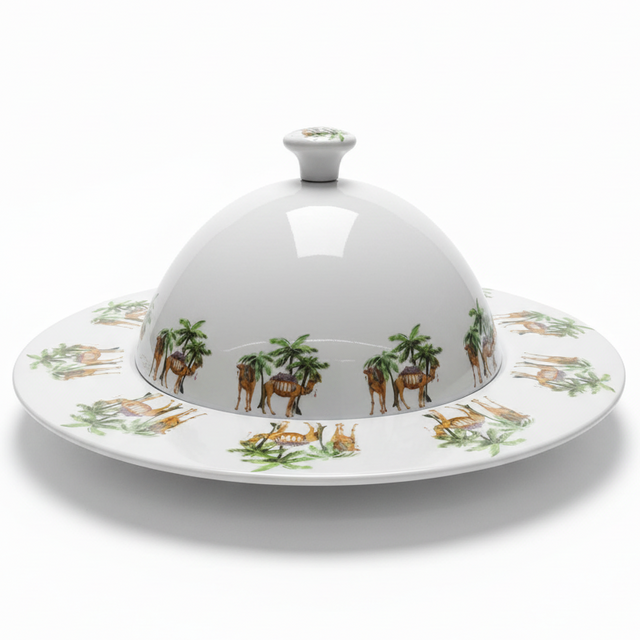 This Yuniverse melamine serving tray combines practical functionality with distinctive desert-inspired design. The 32 cm tray showcases a striking camel and palm tree motif rendered in elegant detail against a clean white background, bringing warmth and narrative to your table setting. The accompanying dome lid protects contents while doubling as a stylish serving vessel, making it equally suited for chilled appetizers or warm pastries. Constructed from resilient melamine, the tray resists chipping and staining while remaining lightweight for effortless handling. An excellent choice for hosting, gifting, or curating a curated home collection that celebrates Middle Eastern design heritage.