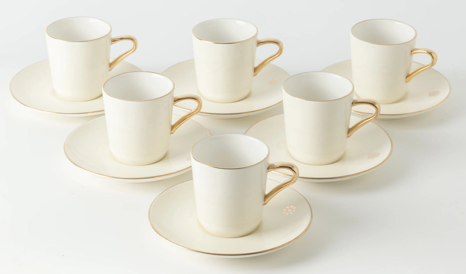 Otantik Mirral Luxury 12-Piece Turkish Coffee Cup & Saucer Set – White with Gold Accent 115CC