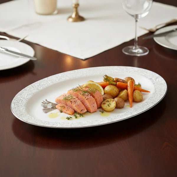Luhpar Premium 14-Inch Ceramic Oval Serving Plate – White with Grey Falcon Design