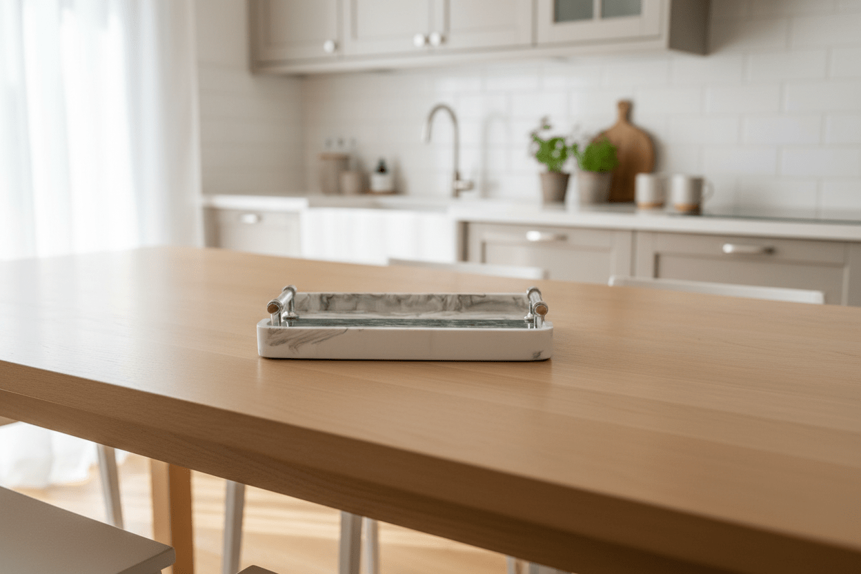 AKDC Premium Rectangular Serving Tray – White Plaster of Paris with Silver & Green Decorative Accents (31 × 22 cm)