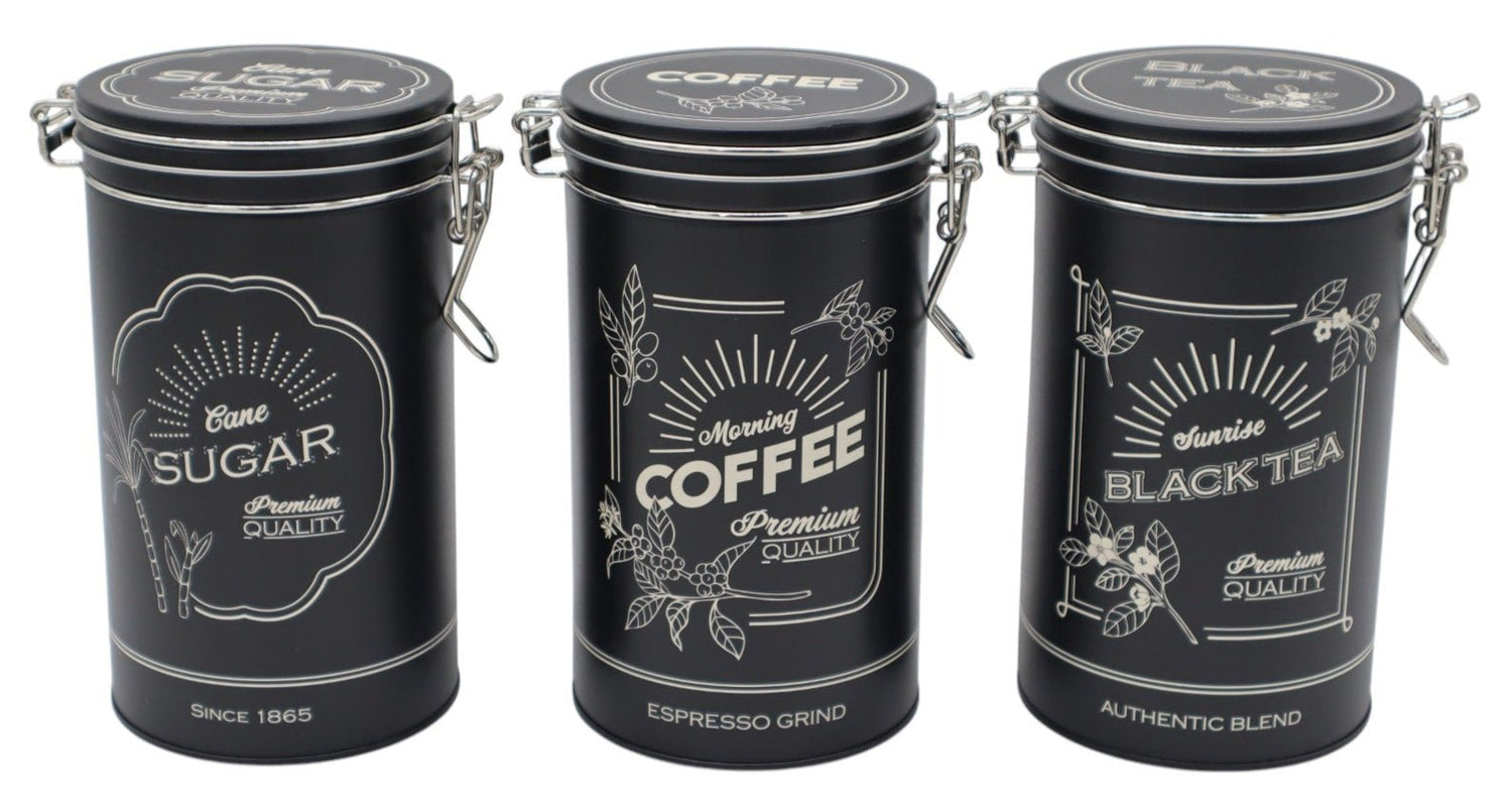 AKDC 3-Piece Black Metal Canister Set for Sugar, Coffee, and Tea – Stylish Matching Kitchen Organizers, 17×9.5 cm Each