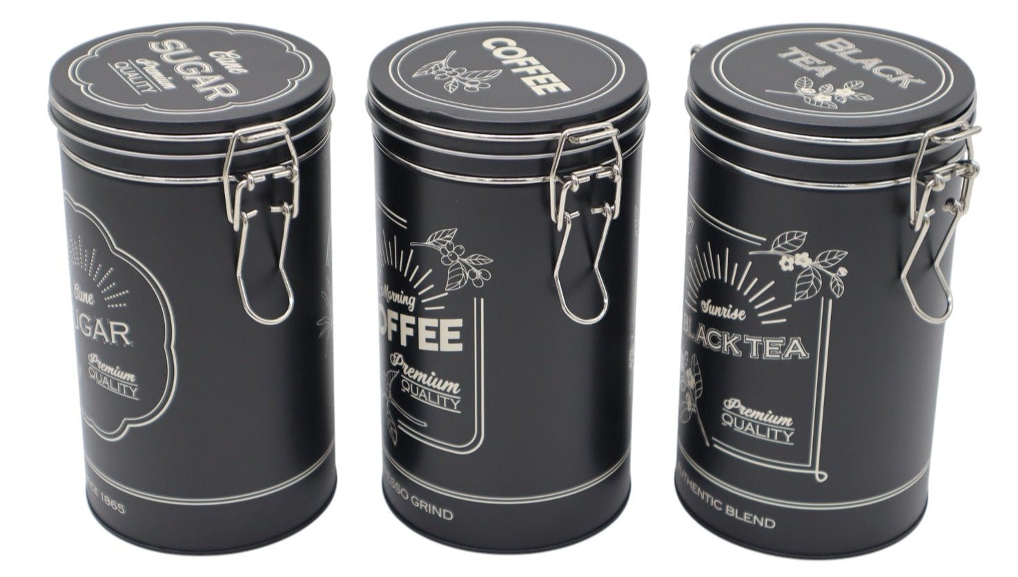 This 3-piece canister set keeps your sugar, coffee, and tea perfectly organized. Each canister comes with a unique logo for easy identification. The black metal finish adds a modern touch to your kitchen. Functional, stylish, and durable, it’s an essential set for every home.