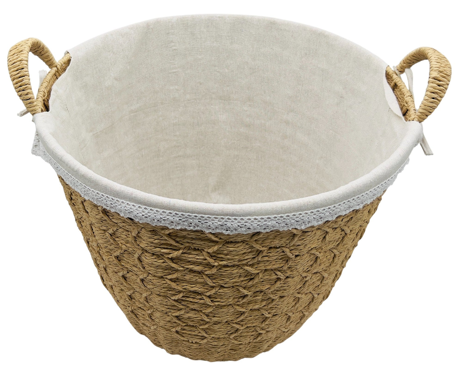 A versatile rattan basket featuring sturdy handles for easy carrying. The brown and white design gives it a fresh, modern look. Spacious enough for laundry, toys, or household storage. Lightweight and practical for daily use.