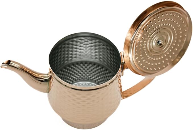 A 32oz copper tea pot with traditional charm and excellent heat conduction. Crafted for both visual appeal and brewing efficiency. Ideal for serving guests in style.