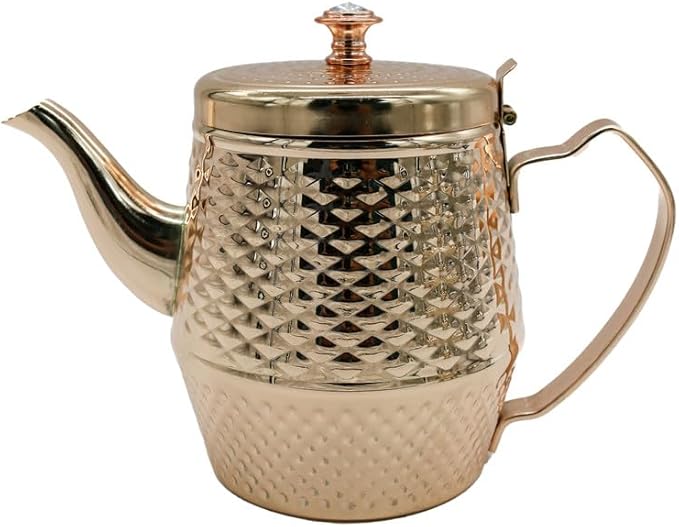 This 48oz stainless steel teapot with a copper finish blends modern durability with classic style. Great for brewing and serving tea in generous portions. Heat-retentive and elegant.