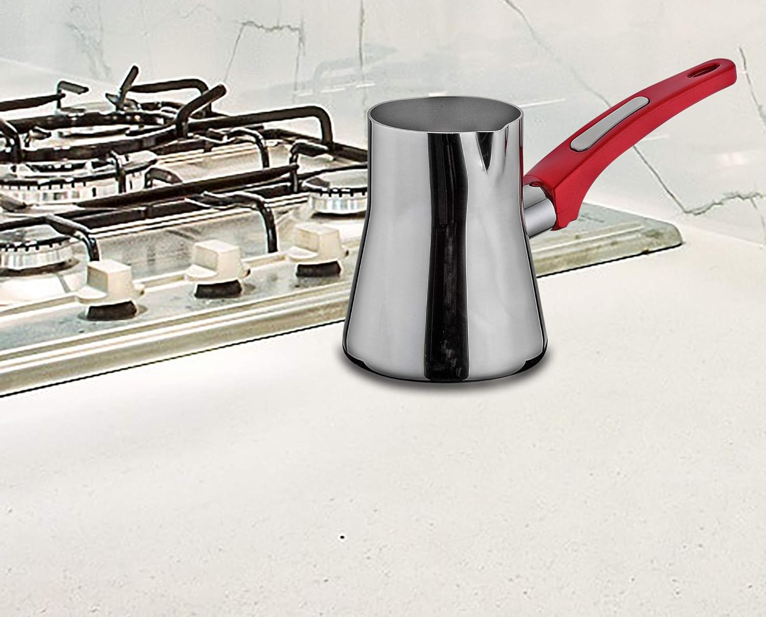 This small coffee warmer is perfect for single servings. Comes with a vibrant red handle for a modern touch. Stainless steel construction ensures durability and fast heating.