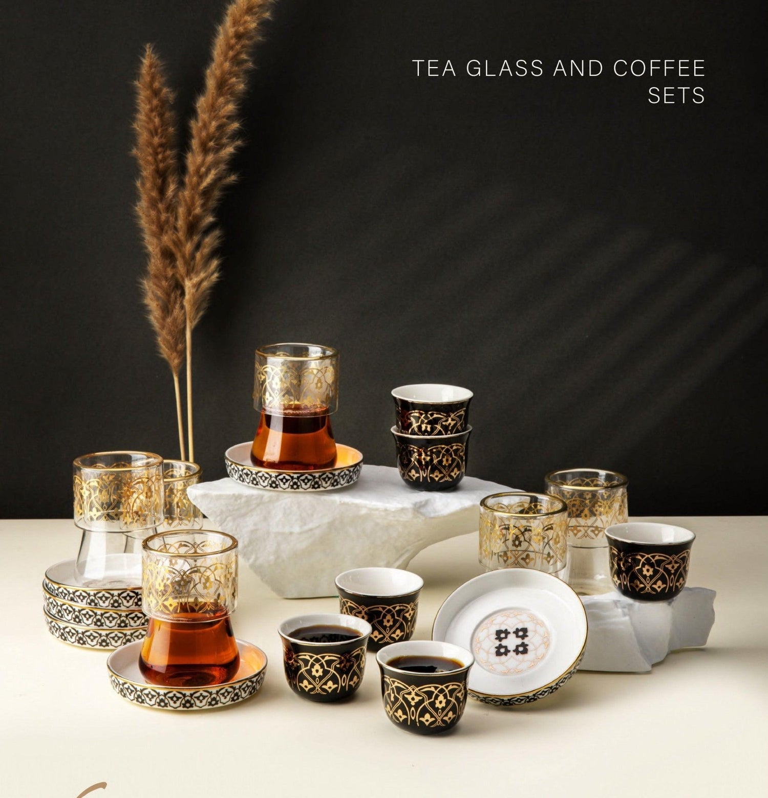 This set features 6 cava cups (90ml), 6 glass cups (130ml), and 6 porcelain saucers. Combines tradition with a modern touch. Ideal for serving both tea and coffee.