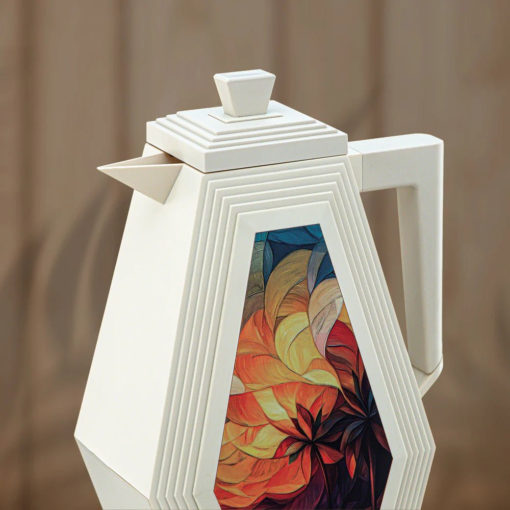 Crafted in a distinctive hexagonal silhouette, this two-piece 0.7L + 0.7L vacuum flask set features a refined white finish enhanced with a vibrant printed panel that brings warmth and visual depth to your table. The structured geometric body creates a bold architectural presence, while the colorful artwork detail adds a contemporary artistic touch — perfectly aligned with modern GCC hospitality.