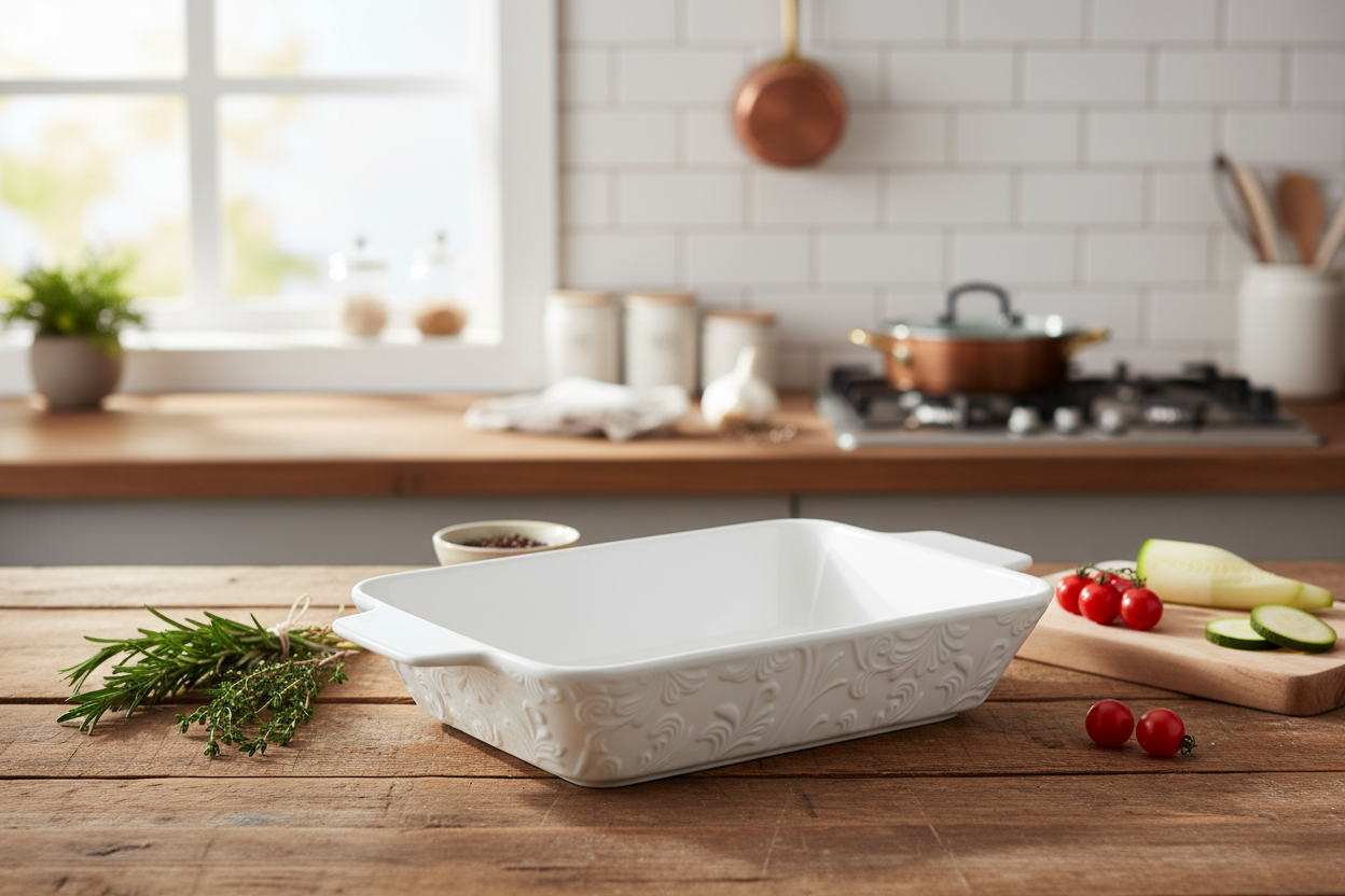 The spacious 30.5cm × 18cm dimensions with 5.5cm depth provide ample capacity for casseroles, lasagnas, roasted vegetables, gratins, and desserts. Built-in handles ensure safe, comfortable grip when transferring hot dishes, while the classic white finish complements any kitchen décor and table setting.