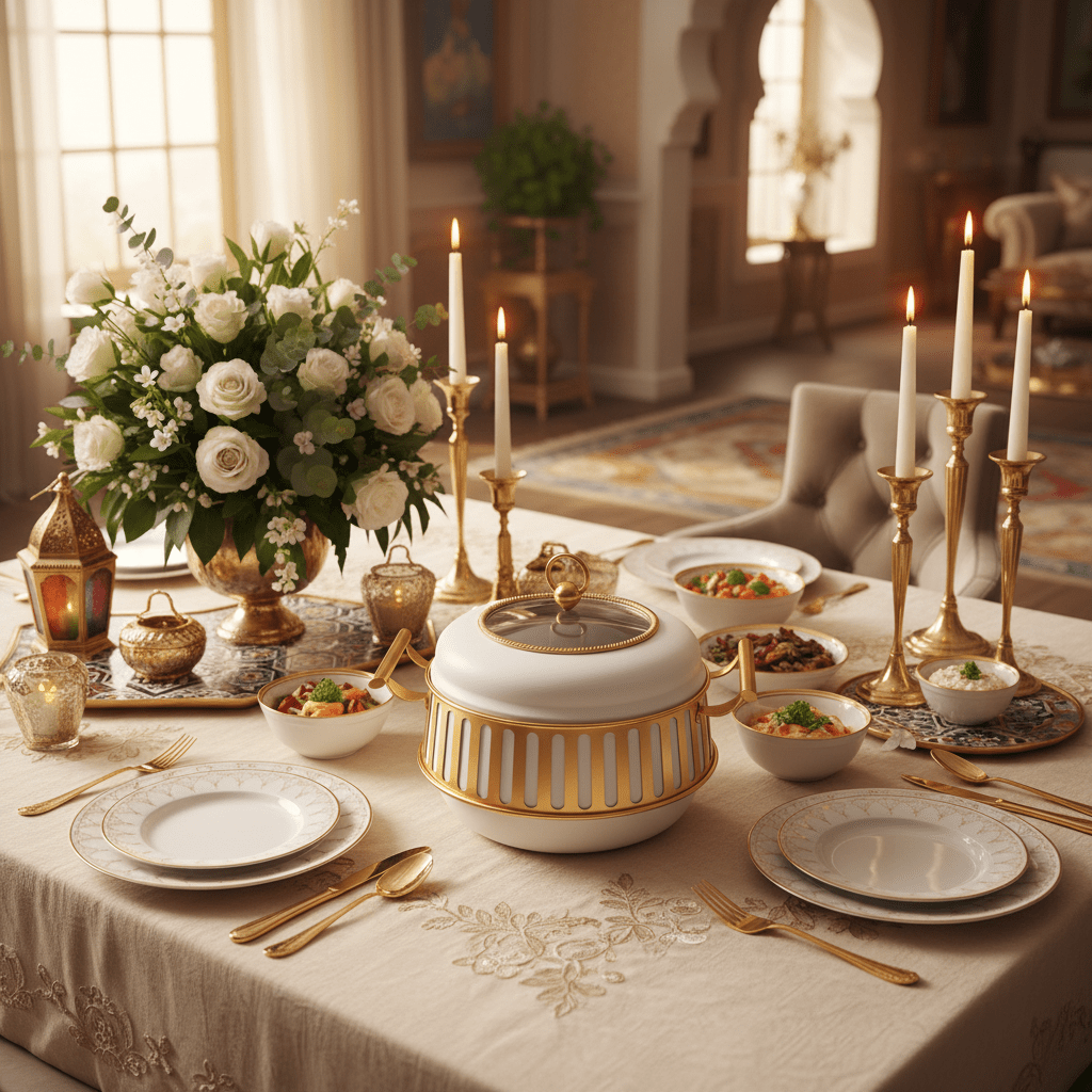 Whether you're hosting a formal dinner, buffet, or special celebration, this chafing dish keeps your food warm while making a beautiful statement on your table. The combination of white ceramic-style finish and gleaming gold details creates a premium, spa-inspired aesthetic that complements any décor.