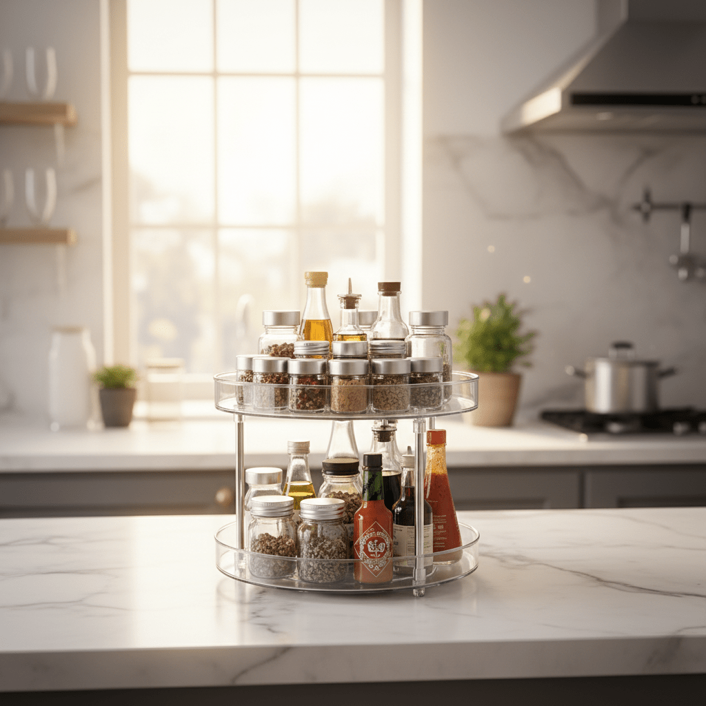 Keep your kitchen, bathroom, or pantry effortlessly organised with this elegant clear turntable organiser. Featuring two rotating acrylic tiers supported by sleek stainless steel poles, it offers 360° access to everything you need — from spices and condiments to skincare and toiletries. The crystal-clear design blends seamlessly into any décor while keeping your essentials beautifully on display.