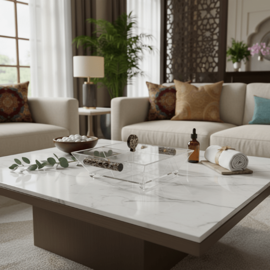 Elevate your entertaining with this exquisite transparent acrylic storage box, featuring four generous compartments and an elegant lid adorned with ornate Arabic calligraphy handles. Perfectly sized at 31 × 31 × 10 cm, this versatile organizer brings both function and refined style to your home.