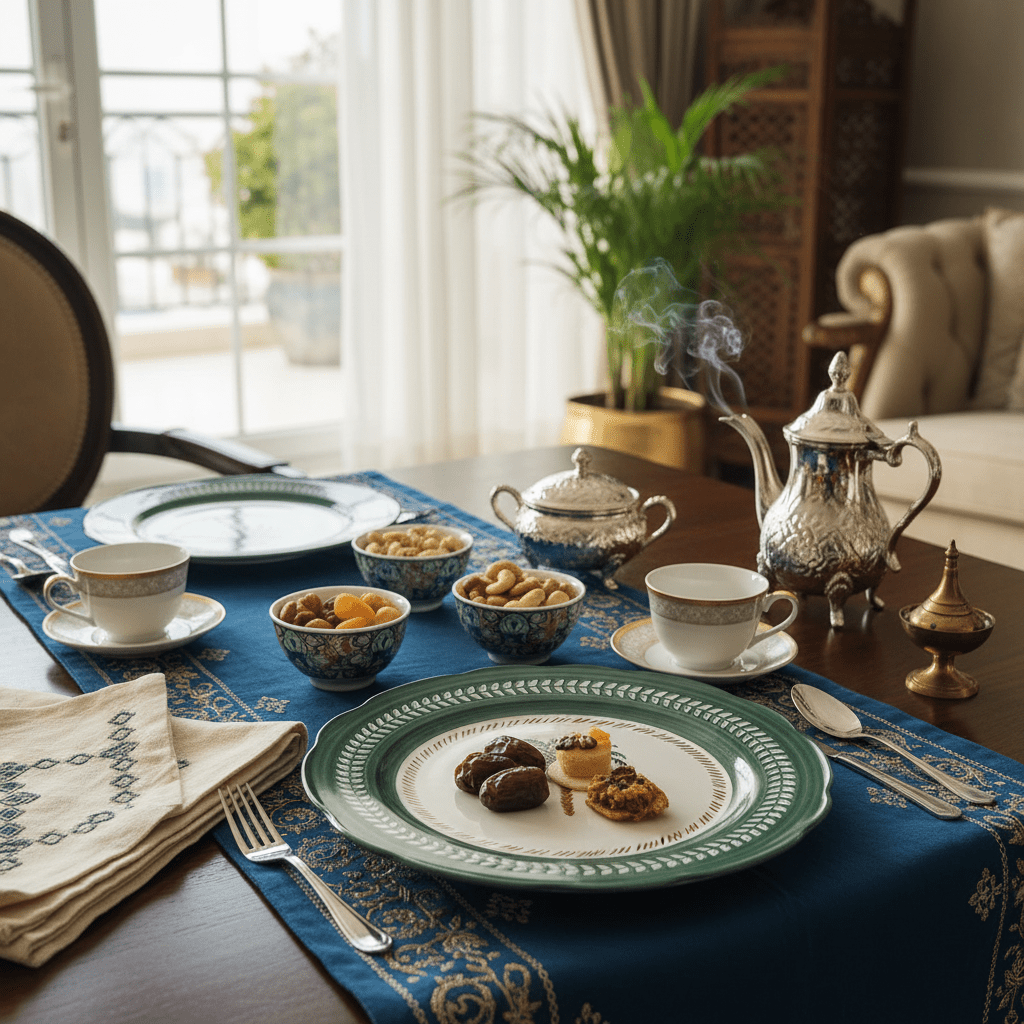 Design Details: The Angela Tropical collection celebrates Middle Eastern hospitality with a touch of coastal charm. The palm tree – a symbol of abundance and welcome – is rendered in warm earth tones and deep greens, while the decorative leaf border adds timeless sophistication to any table setting.