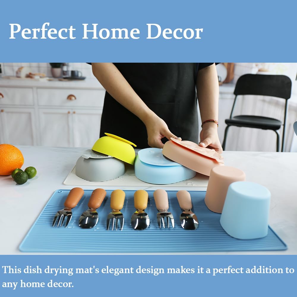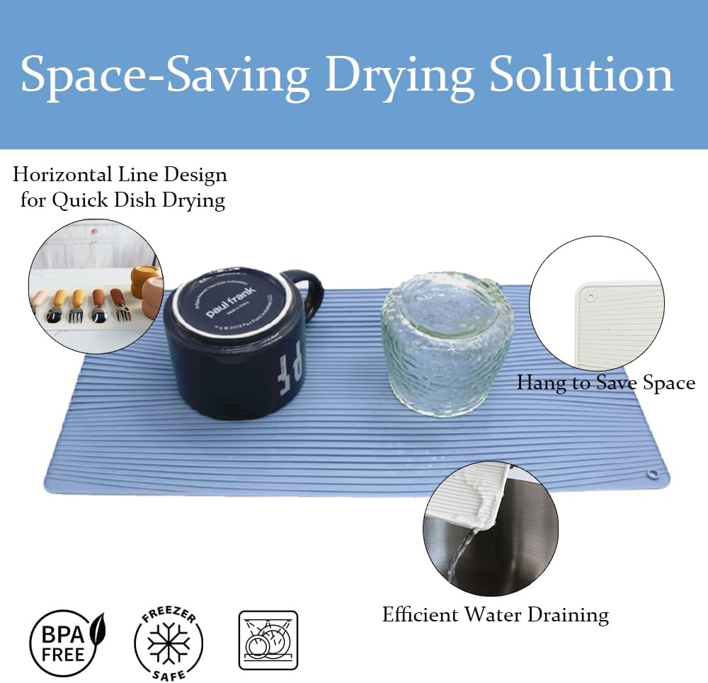 Keep your counters dry with this flexible silicone drying mat in a cool blue shade. It's perfect for drying dishes, glassware, or utensils. The non-slip surface ensures stability and easy cleanup. Roll it up for compact storage when not in use.