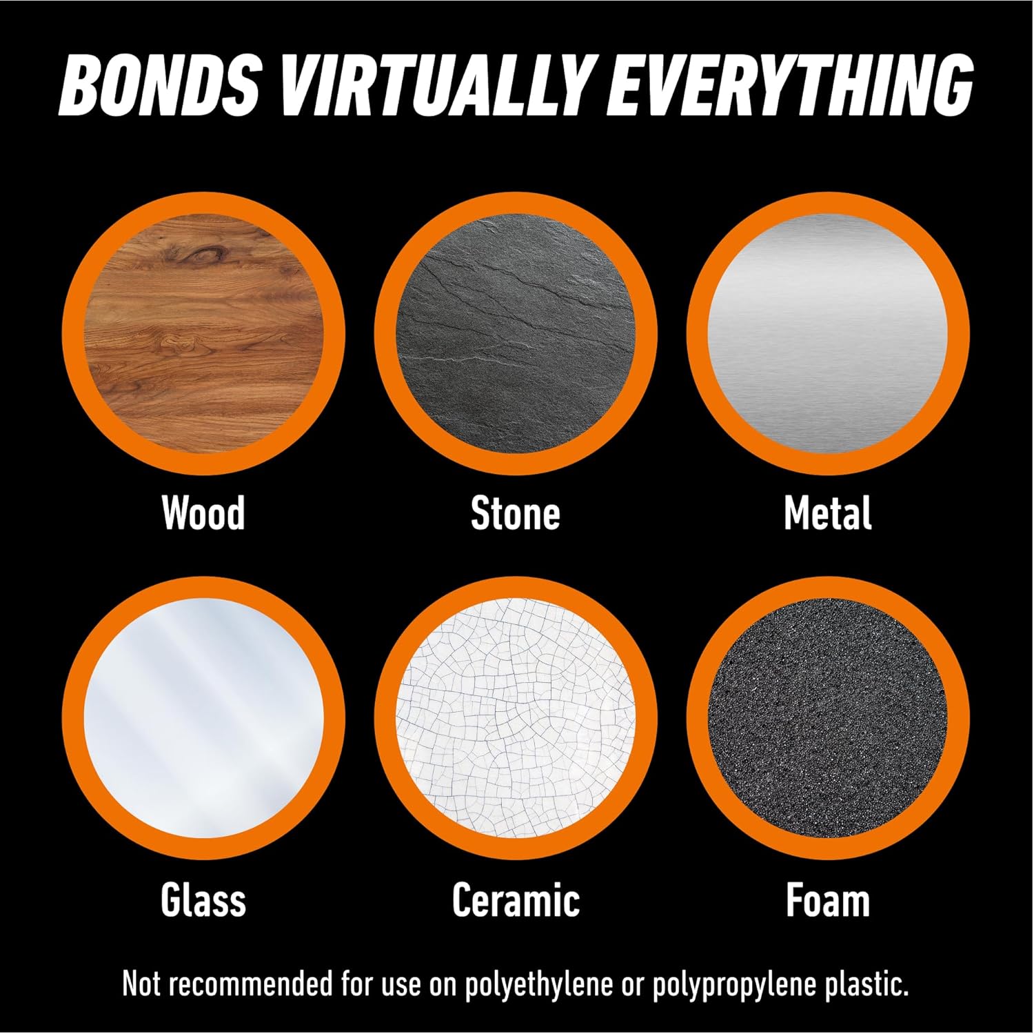 - Bonds virtually everything: wood stone metal ceramic foam glass & more