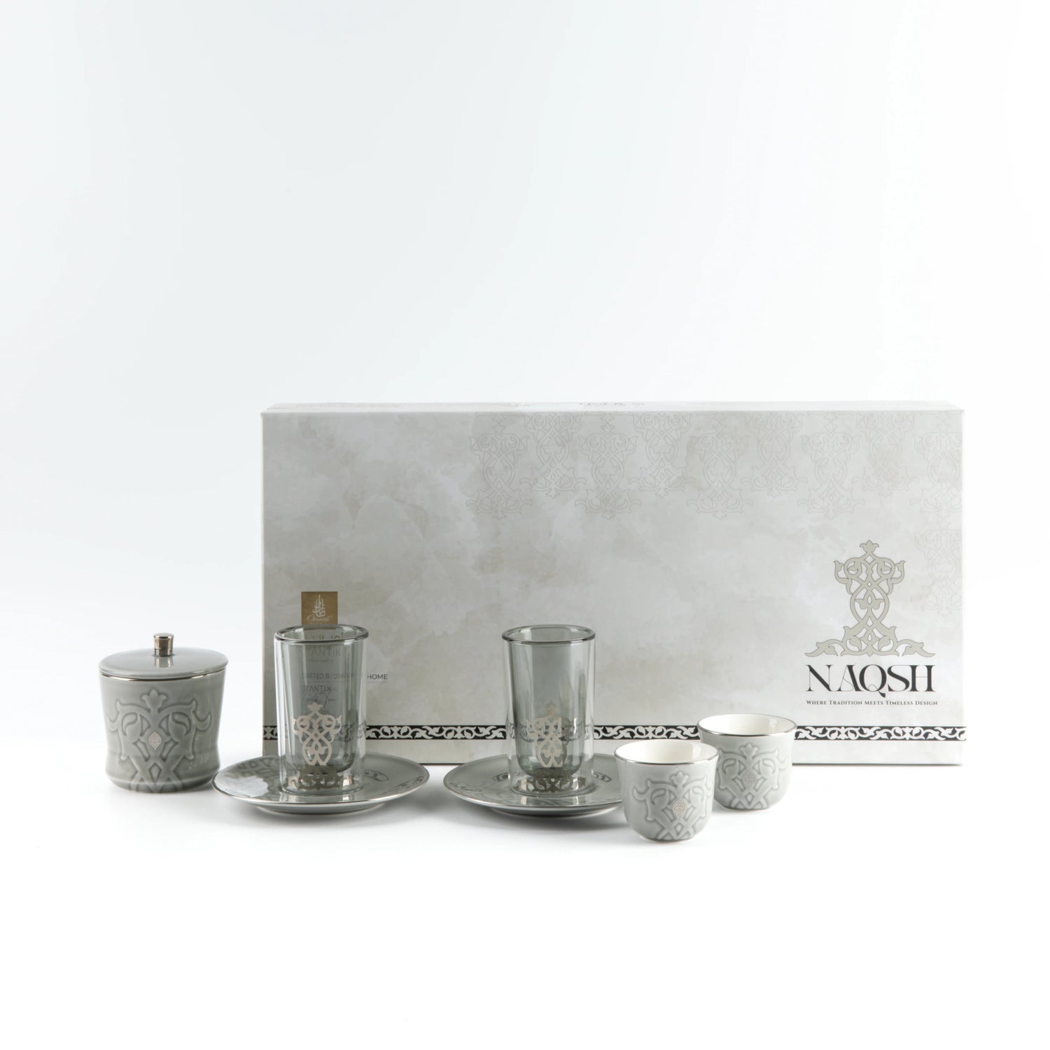 Featuring cool grey tones with sleek silver accents, this 19-piece set offers modern elegance. It includes coordinated pieces for serving both tea and Arabic coffee. The sugar pot completes the ensemble for a polished presentation. Perfect for contemporary homes and stylish gatherings.