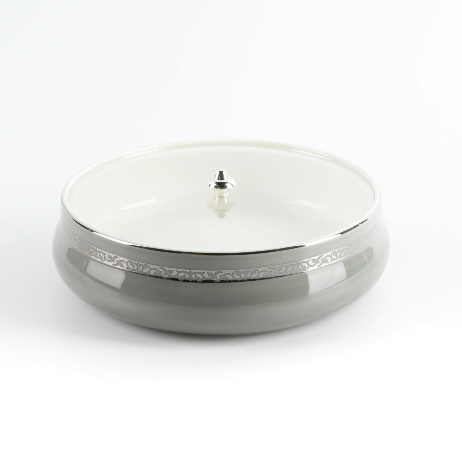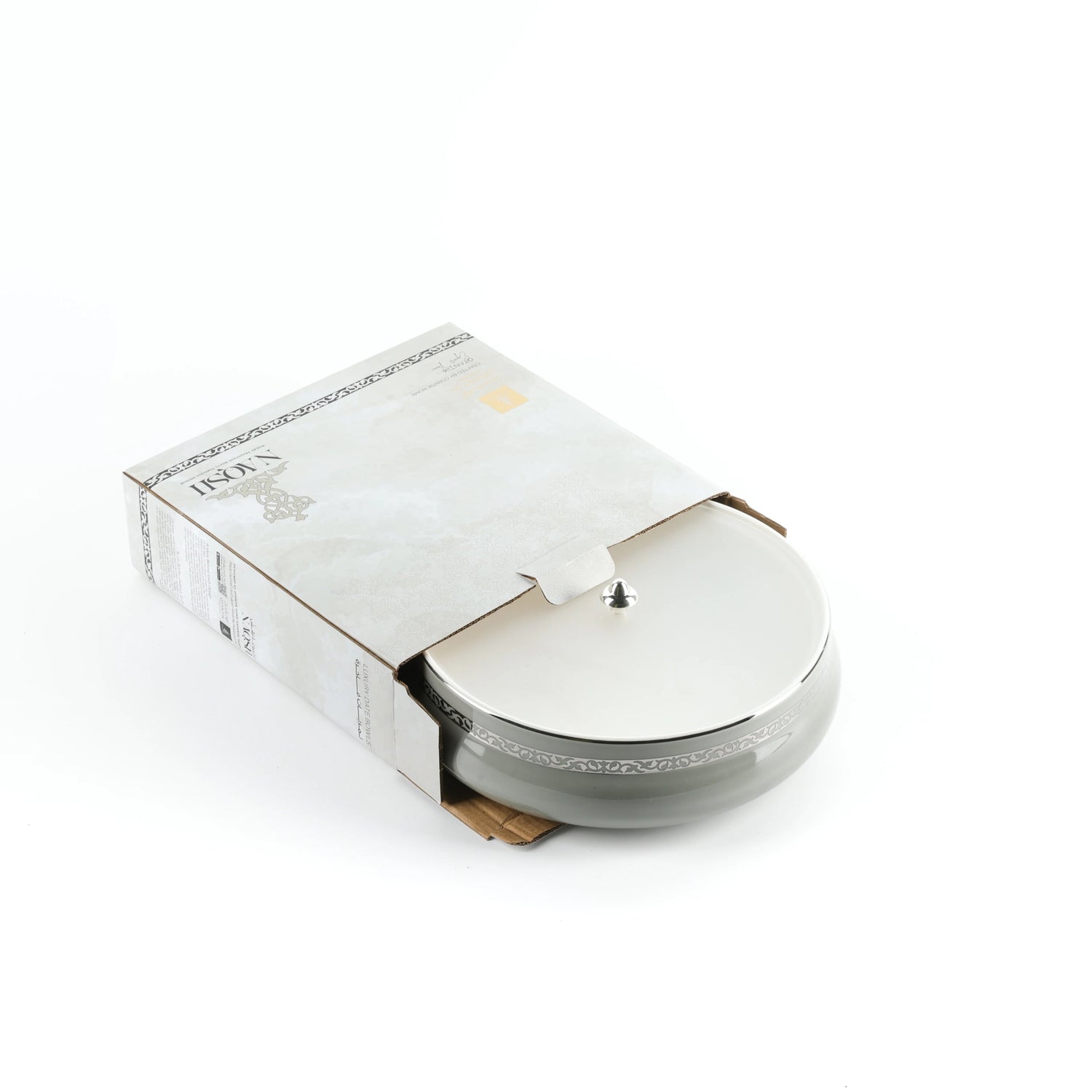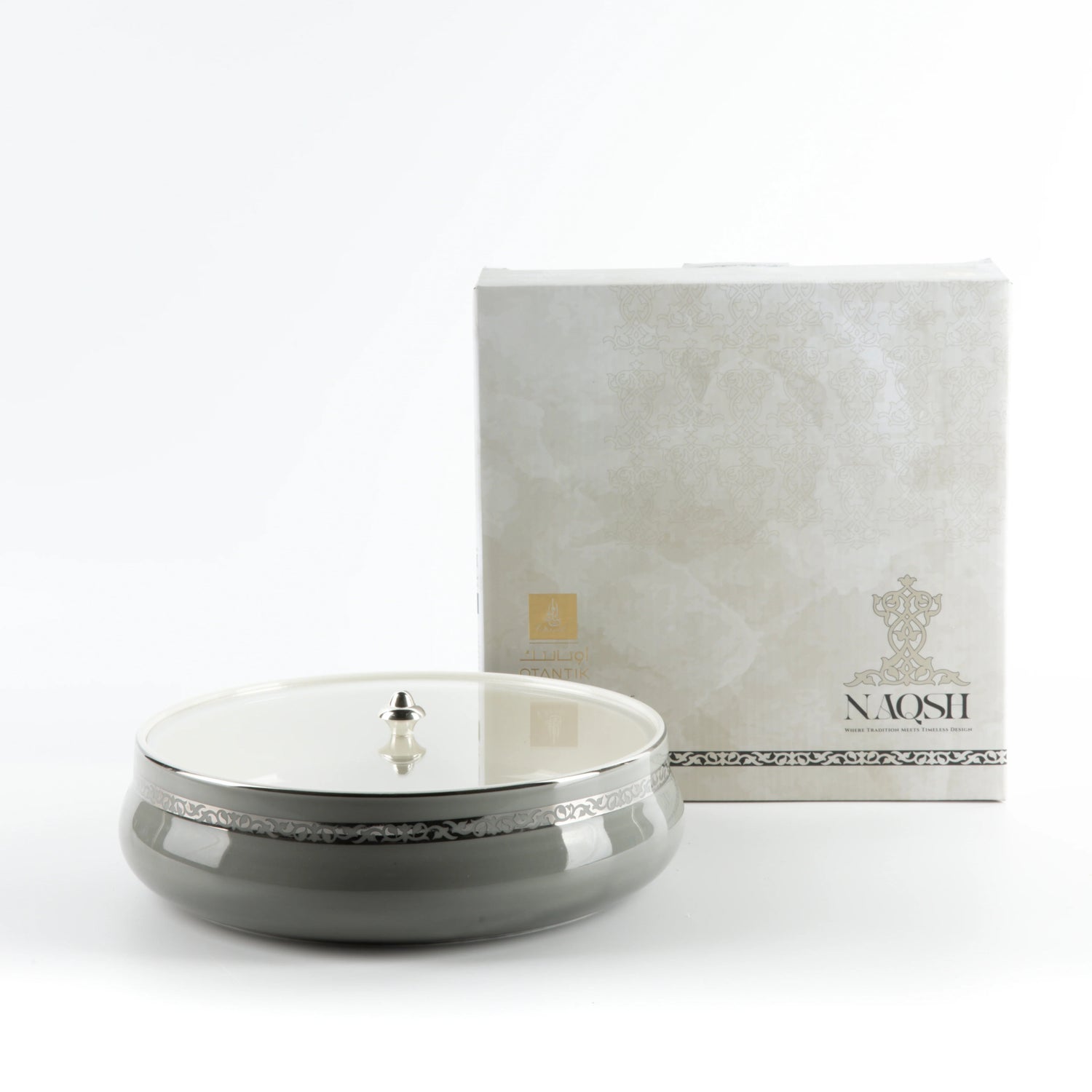 Otantic Naqsh Ceramic Dates Bowl with Lid 23.5cm*6.5cm, Grey/Silver- ET2973