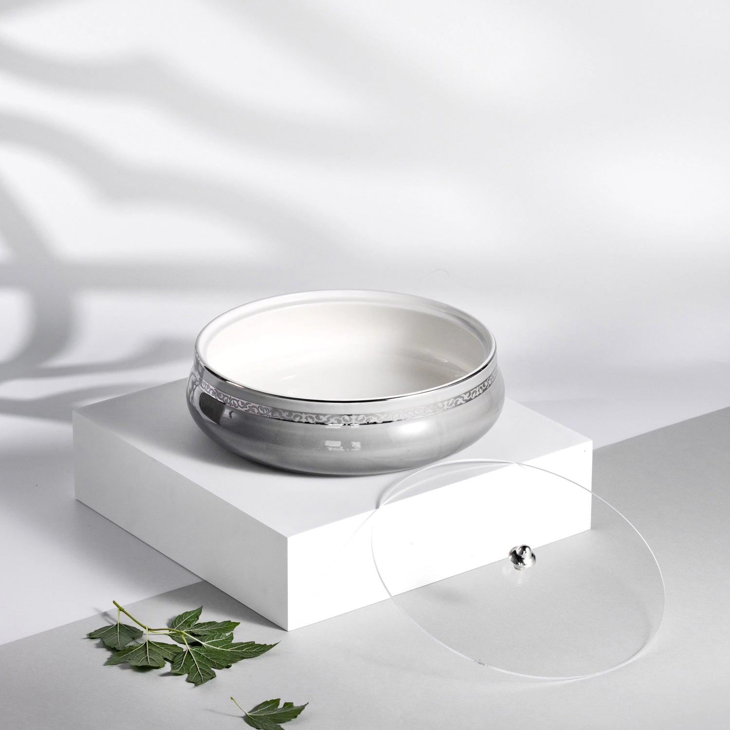 Crafted with a sleek grey body and silver detailing, this 23.5cm dates bowl combines beauty with practicality. Its larger size is ideal for serving generous portions during festive occasions. The fitted lid maintains the freshness of your delicacies. Perfect for elevating the presentation of traditional or modern table settings.