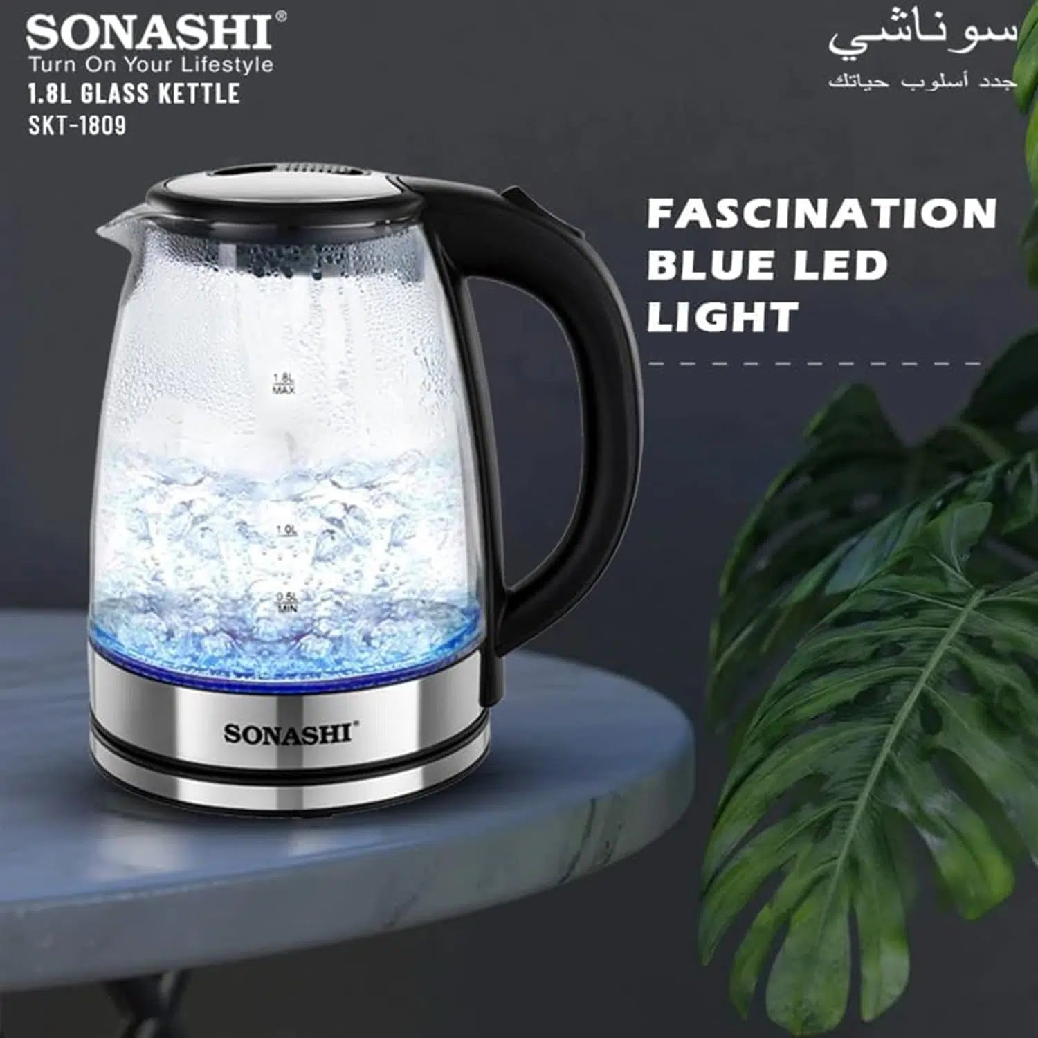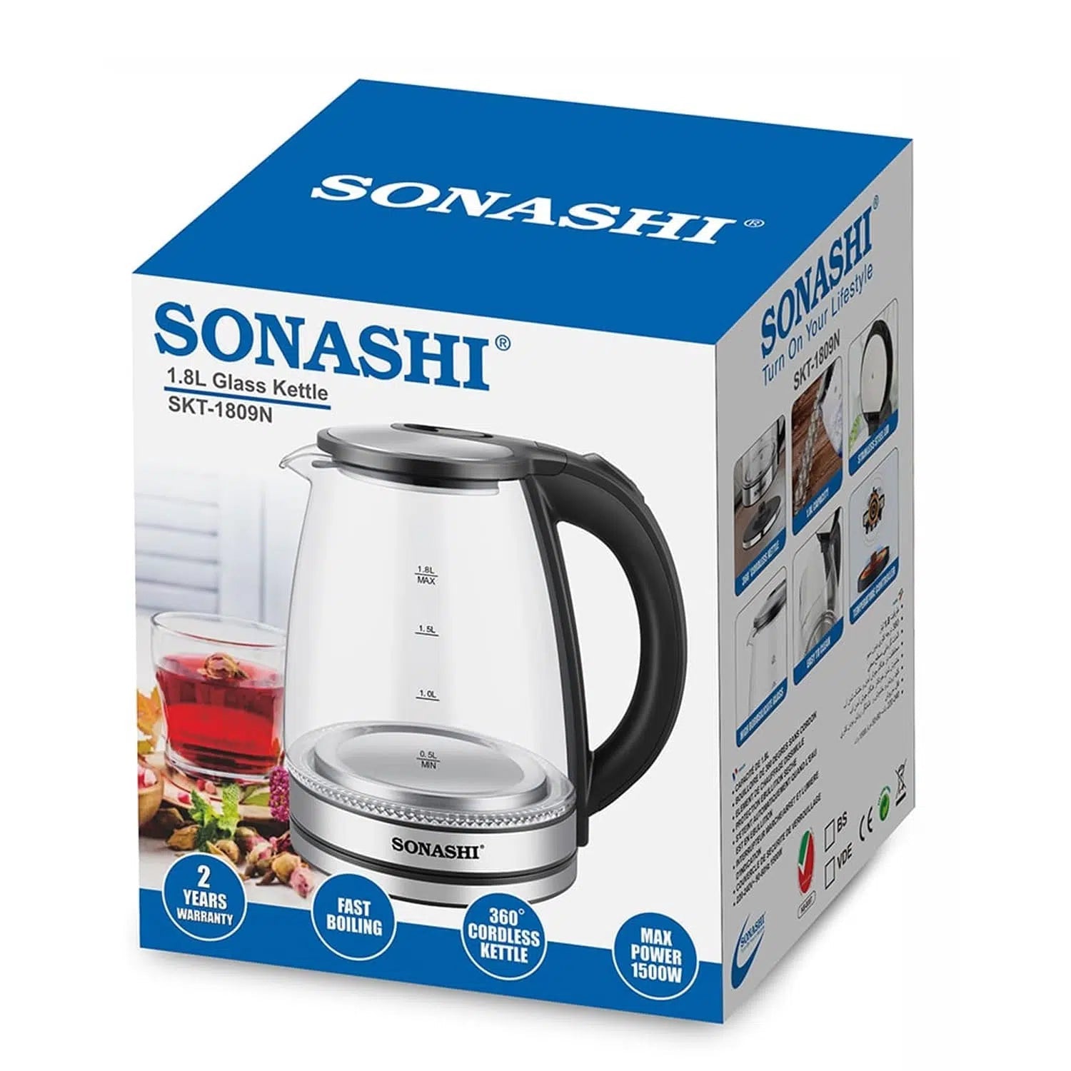 Sonashi 1.8 L Cordless Kettle SKT-1809 - Glass Kettle w/Safety Lock Lid, 360-degree Swivel Base, Auto Shutdown, Power On/Off Indicator Light