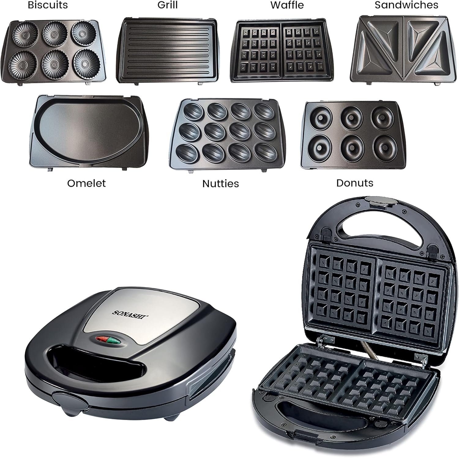 Sonashi 7-in-1 Multi Snack Maker SSM-862 - Detachable Sandwich, Grill, Donut, Waffle, Cupcake, Nutty, Omelet Making Plates